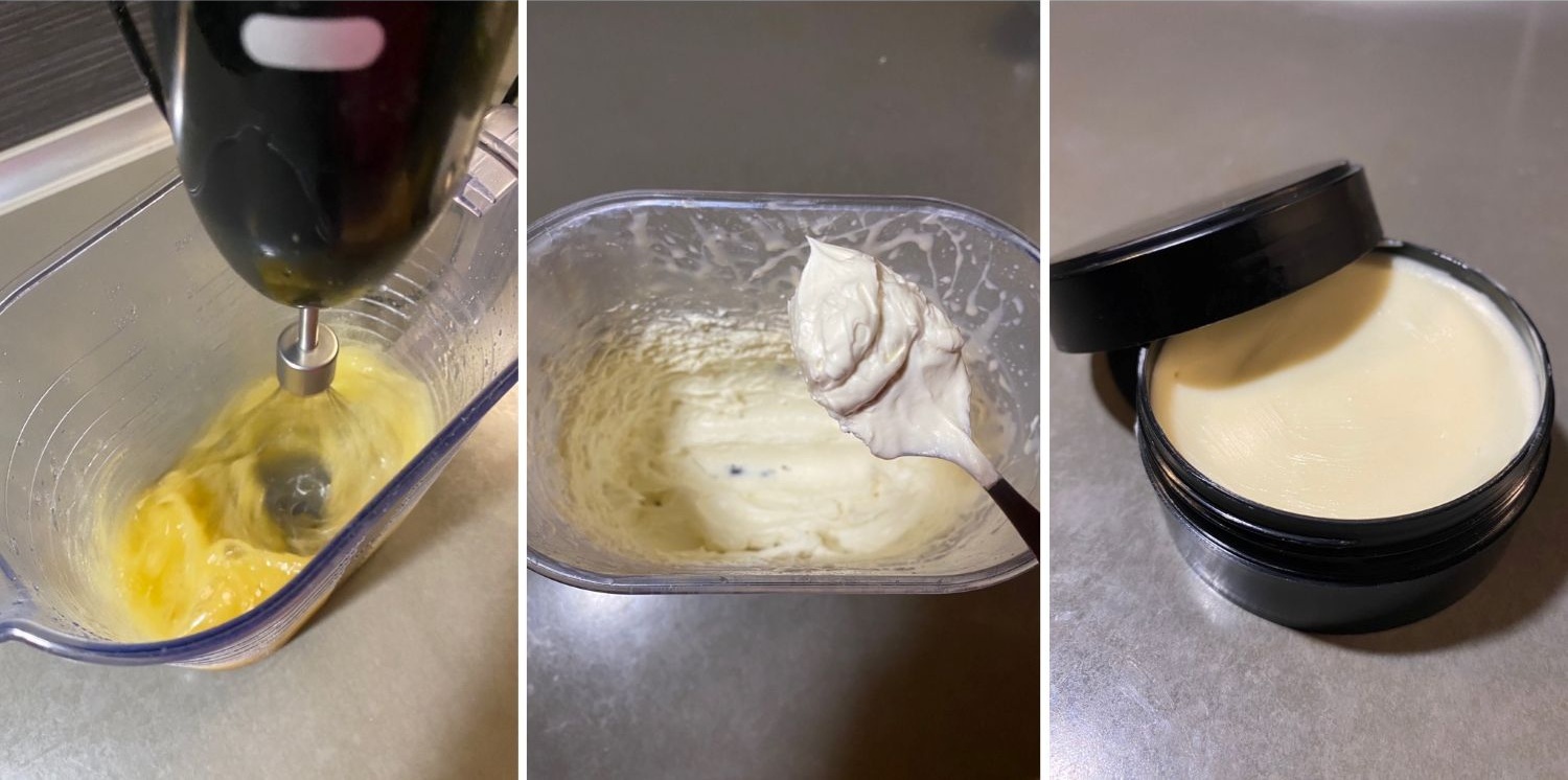 - Je možné přidat i včelí vosk (př. jeho rostlinnou variantu – mandlový či kandelilový) a několik kapek levandulového éterického oleje jako volitelný doplněk.