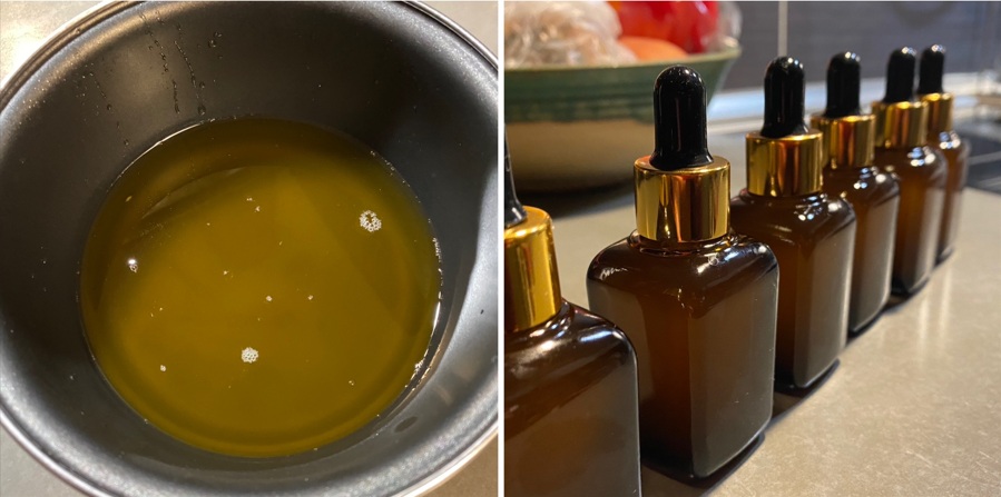 Do menší nádoby nalijte připravený olej a přidejte bambucké máslo. Postavte ji do vodní lázně na mírnou teplotu, aby se máslo postupně rozpustilo. Směs občas promíchejte, aby se vše rovnoměrně spojilo. - Odstavte a ochlaďte